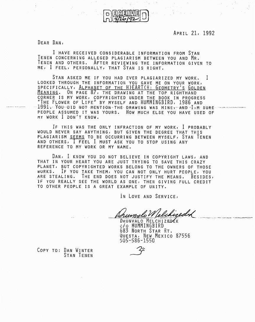 2) Mr. Melchizedek makes it clear that the offending work is in Mr. Winter's now-prohibited "The Alphabet of the H)EART(H", and that it includes plagiarism of Mr. Melchizedek's work as well. --Second paragraph, from Mr. Melchizedek's April 1992 letter, above.